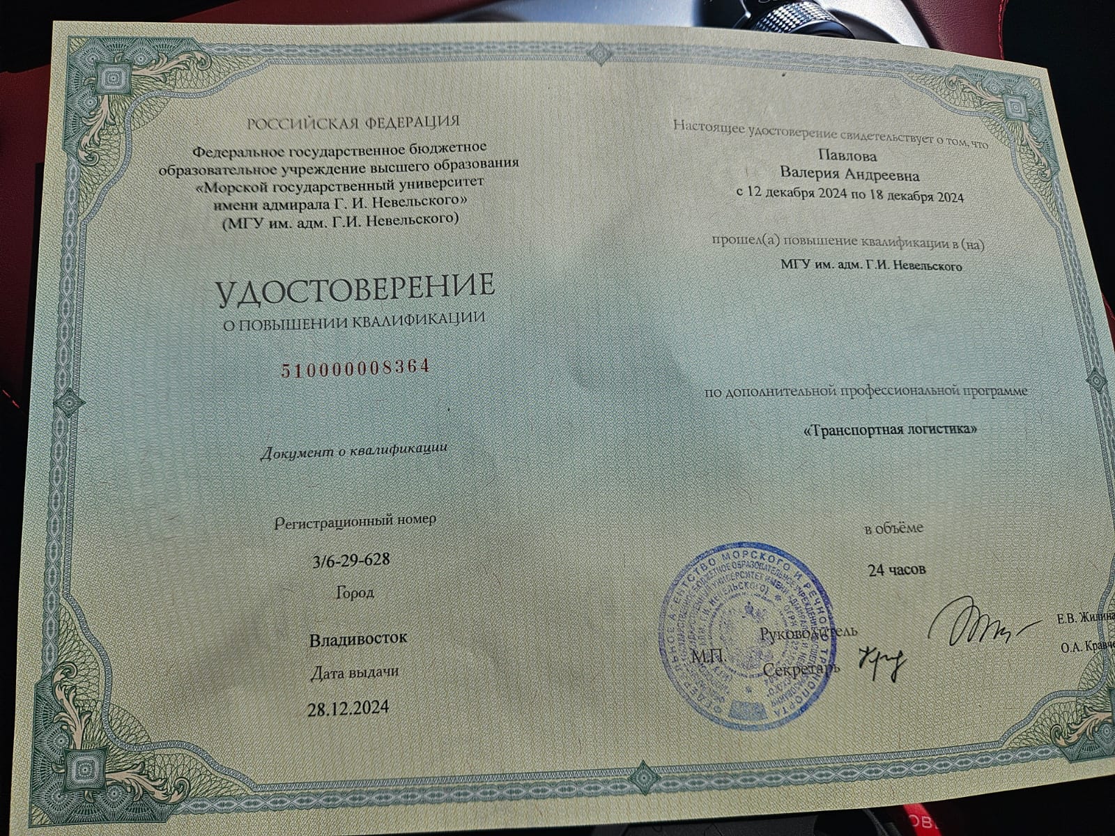 | 12.2024 | ФГБОУ ВО "Морской государственный университет имени адмирала Г.И. Невельского" , г. Владивосток | краткосрочное повышение квалификации | "Организация логистической деятельности на транспорте" | удостоверение о дополнительном образовании | ||