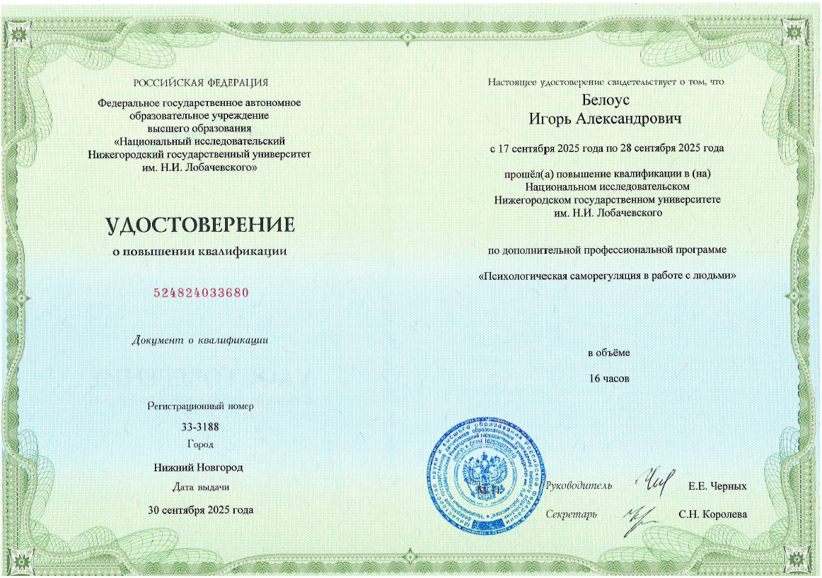 | 09.2025 | ФГАОУ "Национальный исследовательский Нижегородский государственный университет им. Н.И. Лобачевского" , г. Нижний Новгород | краткосрочное повышение квалификации | Психологическая саморегуляция в работе с людьми | Удостоверение о повышении квалификации | ||