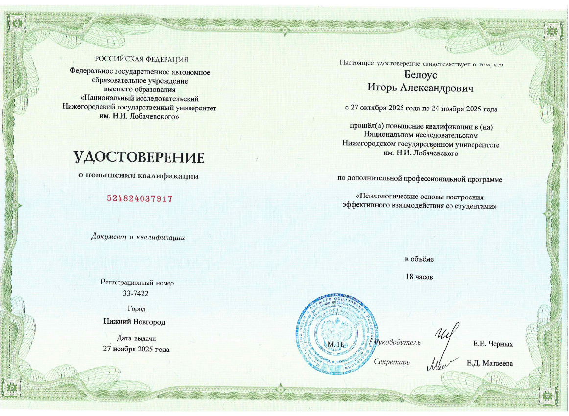 | 10.2025 - 11.2025 | ФГАОУ ВО "Нижегородский государствееный университет им. Н.И. Лобачевского" , г. Нижний Новгород | краткосрочное повышение квалификации | Психологические основы построения эффективного взаимодействия со студентами | удостоверение о повышении квалификации | ||