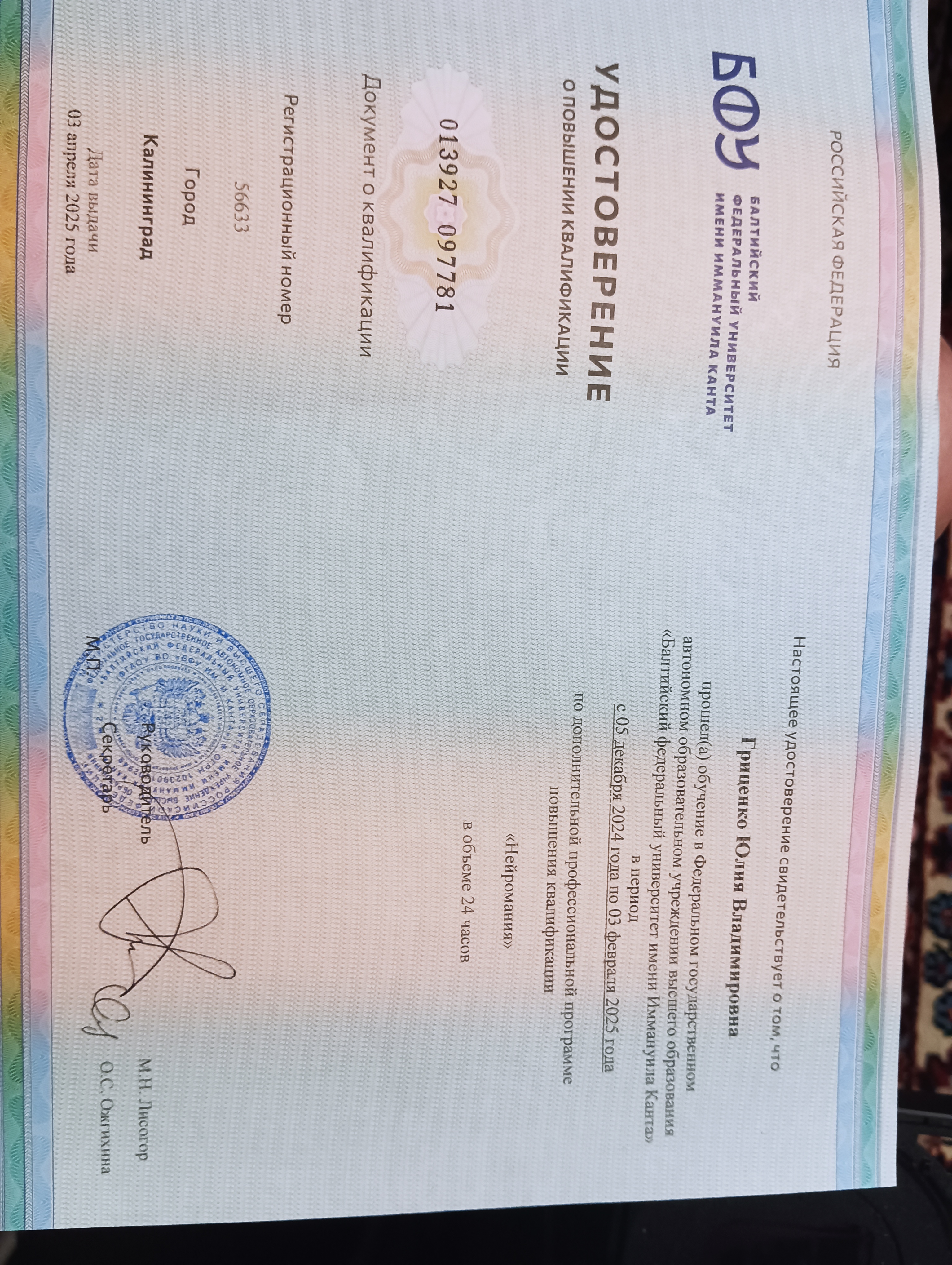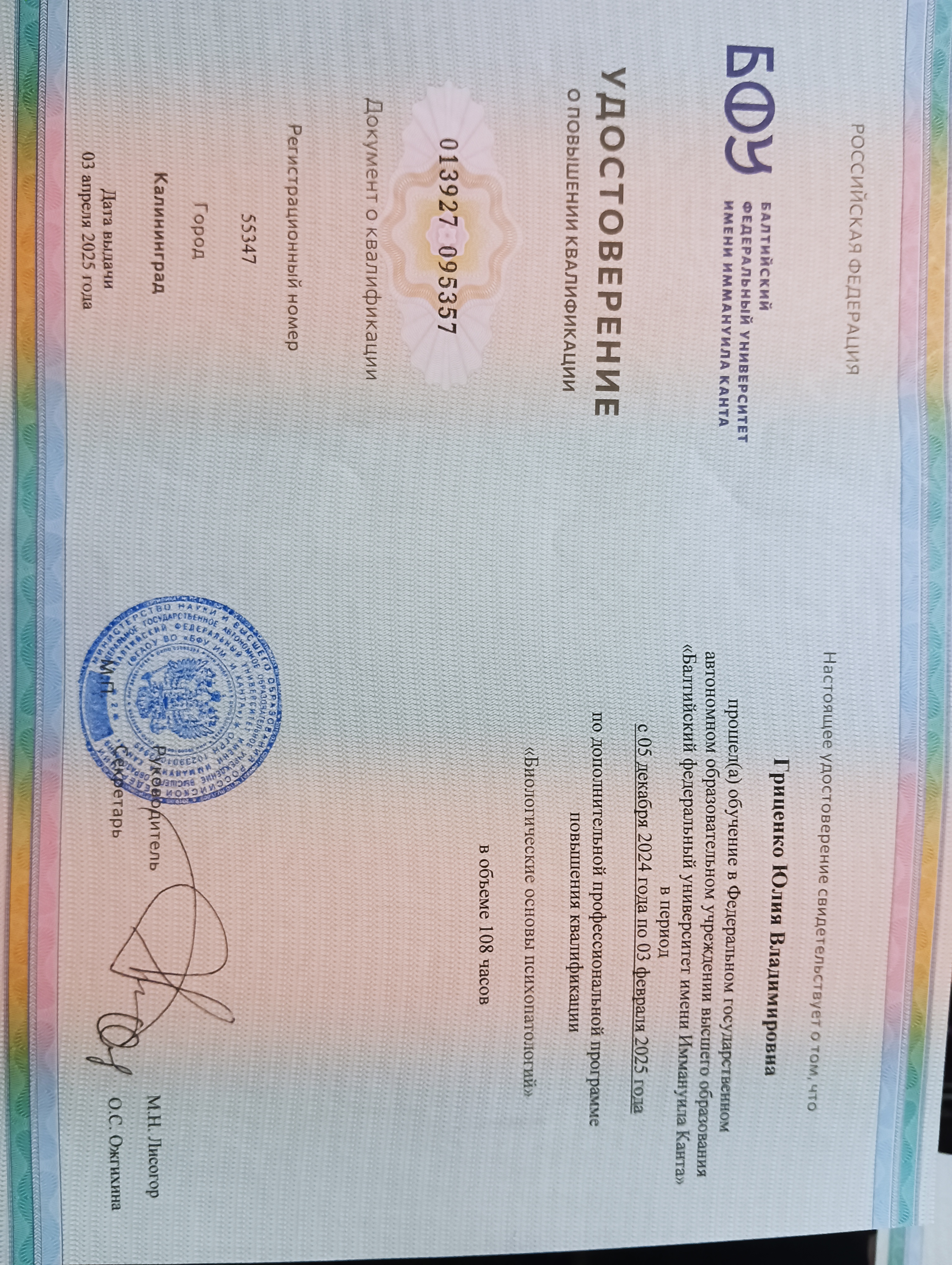 | 12.2024 - 02.2025 | Федеральное государственное автономное образовательное учреждение высшего образования "Балтийский федеральный университет имени Иммануила Канта" г. Калининград , г. Калининград | краткосрочное повышение квалификации | Биологические основы психопатологий |