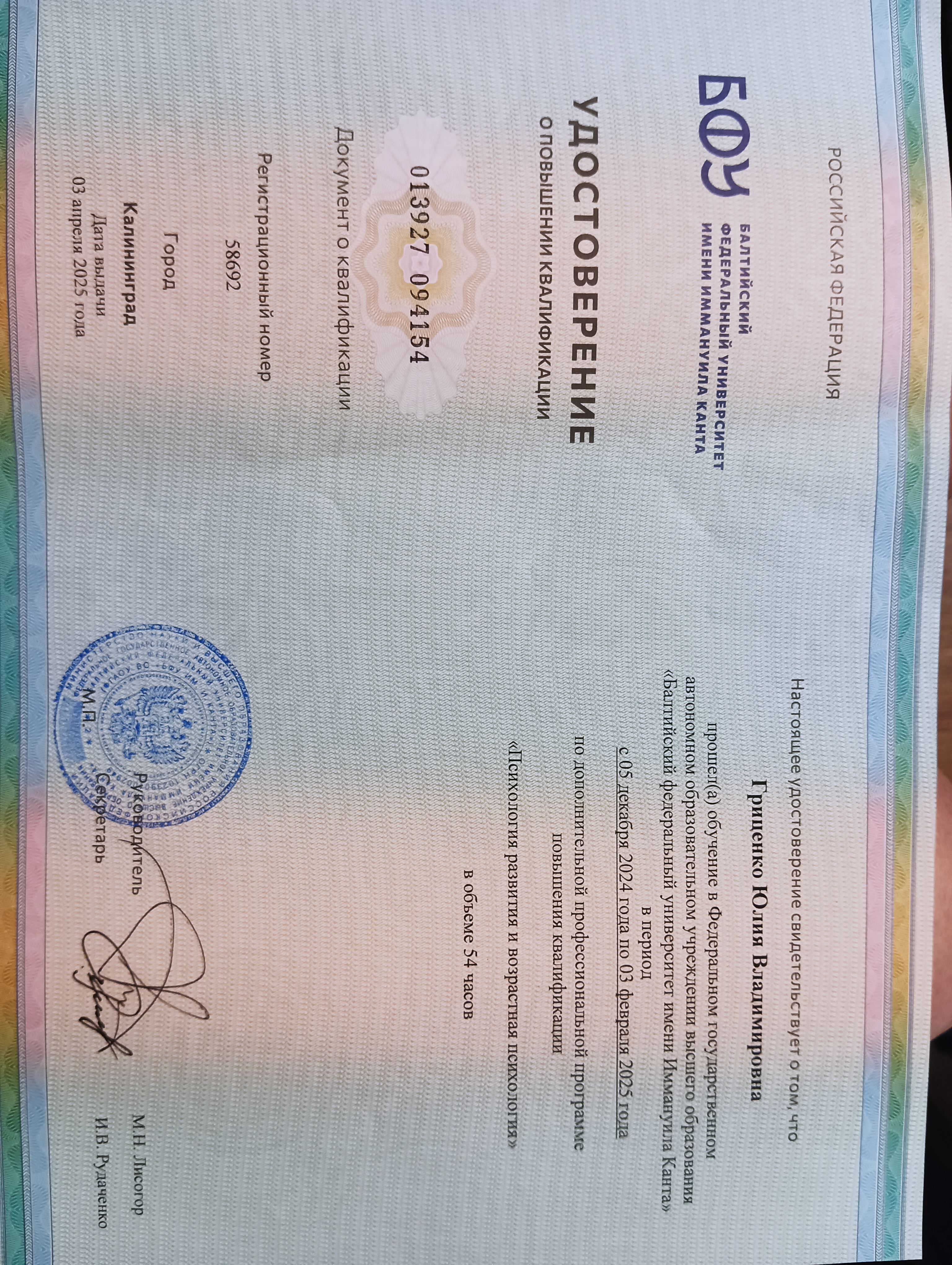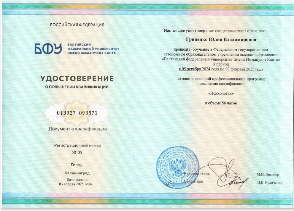 | 12.2024 - 02.2025 | ФГАОУ ВО "Балтийский федеральный университет имени Иммануила Канта" , г. Калининград | курсы | психология |