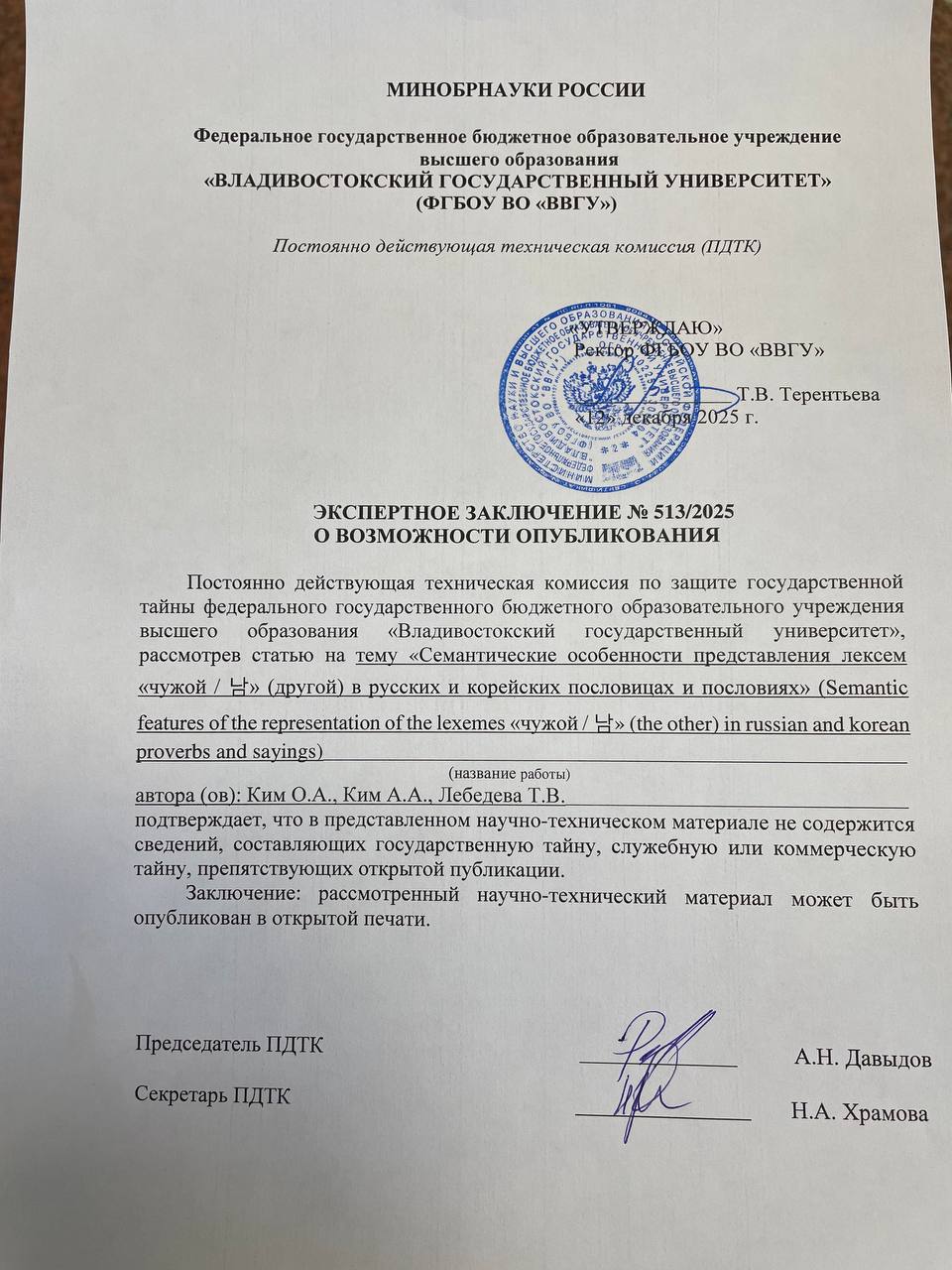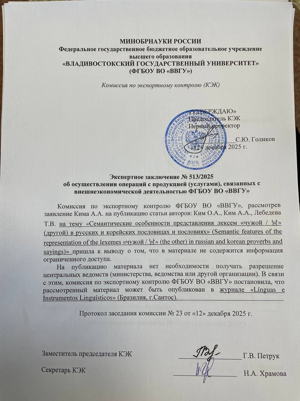 Semantic features of the representation of the lexemes «чужой / ?» (the other) in russian and korean proverbs and sayings