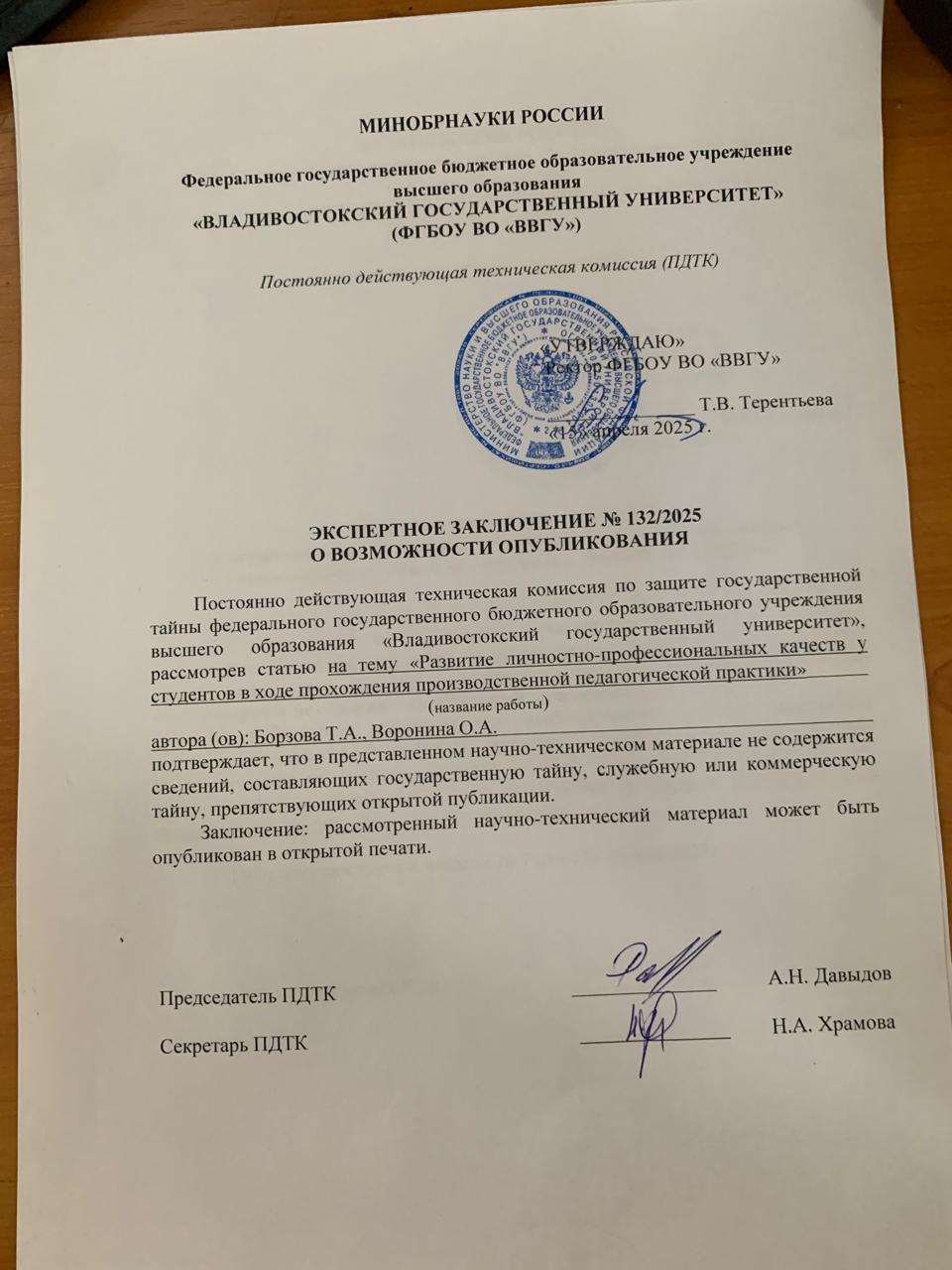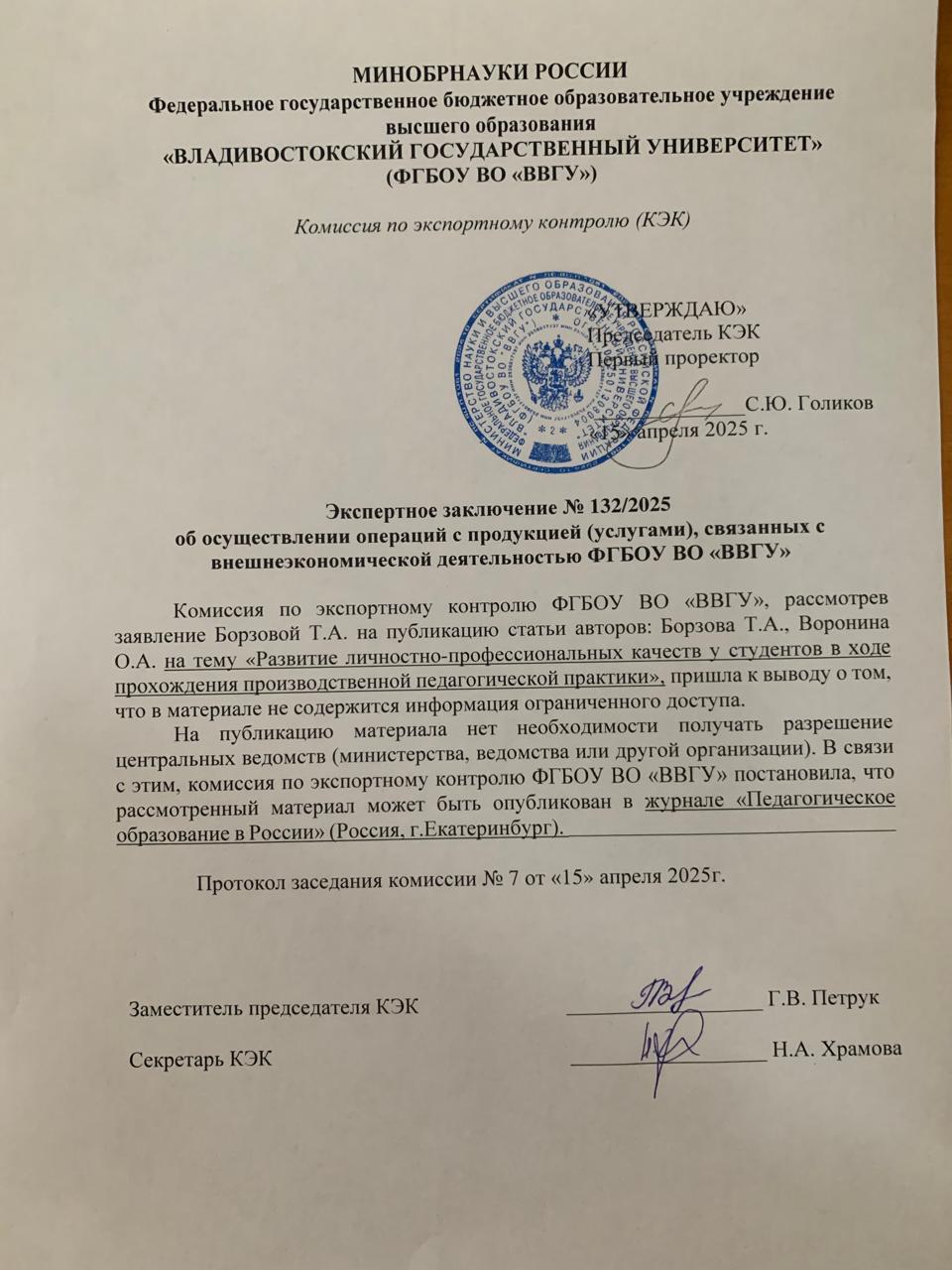 РАЗВИТИЕ ЛИЧНОСТНО-ПРОФЕССИОНАЛЬНЫХ КАЧЕСТВ У СТУДЕНТОВ В ХОДЕ ПРОХОЖДЕНИЯ ПРОИЗВОДСТВЕННОЙ ПЕДАГОГИЧЕСКОЙ ПРАКТИКИ