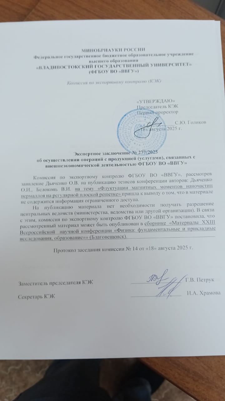Белоконь, В. Флуктуации магнитных моментов наночастиц пермаллоя на регулярной плоской решетке / В. Белоконь, Дьяченко // Материалы XXIII региональной научной конференции «Физика: фундаментальные и прикладные исследования, образование», г.Благовещенск. — Благовещенск : Амурский государственный университет, 2025. — С. 81.